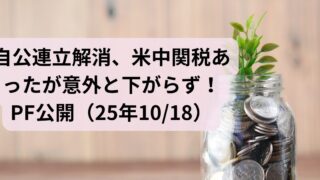 ポートフォリオ 自公連立解消、米中関税あったが意外と下がらず!PF公開(25年10/18) 先週金曜日に自公の連立解消報道や米中関税など、市場にネガティブなニュースが多く先物は2000円以上下落していて今週はかなり下がるなと思っていました。しかし、トランプのSNSでのTACO匂わせや自民維新の連立の可能性が報道されたことで市場が落... 2025.10.19 ポートフォリオ